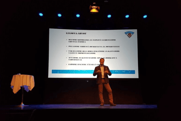 Tilaisuuden viimeisenä puhujana oli hartaasti odotettu puhuja, Leijonien päävalmentaja Jukka Jalonen. Ennen Jukan saapumista lavalle katsoimme screeniltä vuoden 2019 jääkiekkofinaalin Suomi - Kanada parhaita paloja ja palasimme viime keväänä toteutuneeseen unelmaan. Kyseessä oli yksi kaikkien aikojen tempuista, sillä harva suomalainen uskoi joukkueen menestykseen.