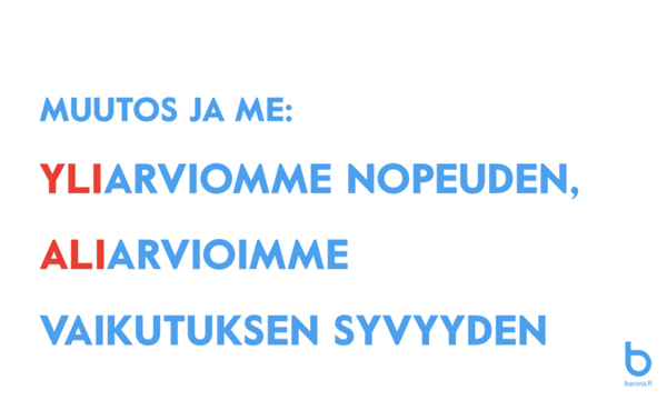 Lähes aina yksilöinä ja yhteiskuntina yliarviomme muutoksen nopeuden. Kun jotain muutosta ei tapahdukaan näkyvästi tai heti, muutos unohdetaan ja se pääsee yllättämään salakavalasti. Tulevaisuuskyvyn lisääntyminen on siksi relevanttia, että muutosten päällekkäisyys ja tiheys ovat kasvaneet.